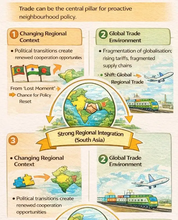 India stands at a critical juncture where it can redefine its neighbourhood policy through trade-led engagement. By leveraging geographical proximity and adopting a more open and cooperative approach, India can strengthen regional integration, enhance strategic influence, and ensure mutual economic growth in South Asia.
