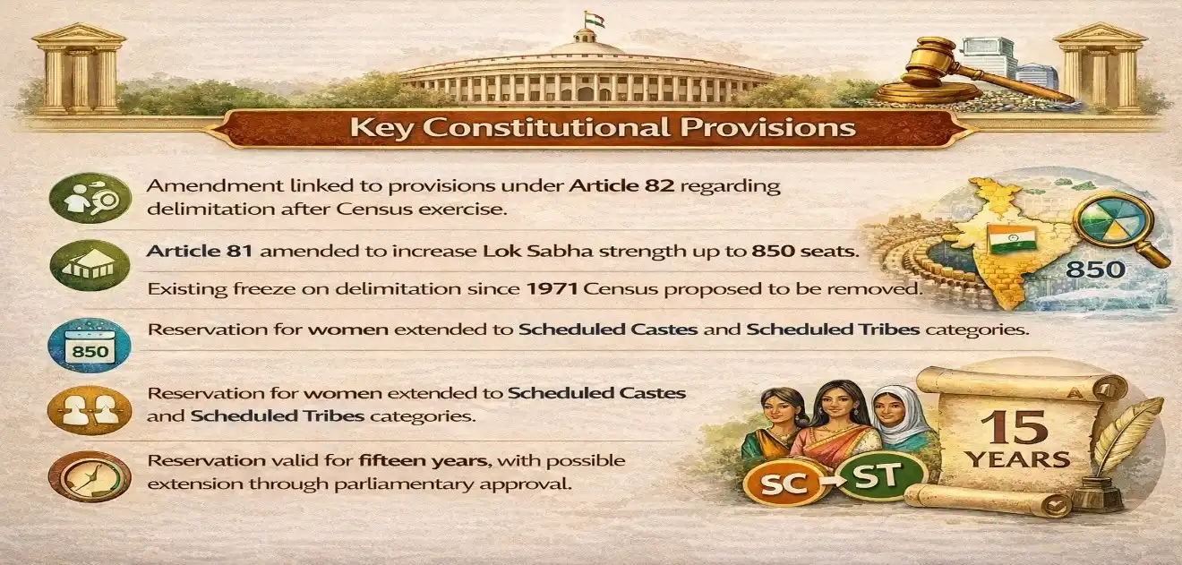 Government has proposed Constitutional Amendment Bills based on 2011 Census data framework. Lok Sabha strength proposed to increase from 543 seats to 850 members. One-third reservation for women introduced in Lok Sabha and State Assemblies. Delimitation to be undertaken before implementation of women’s reservation provisions nationwide.