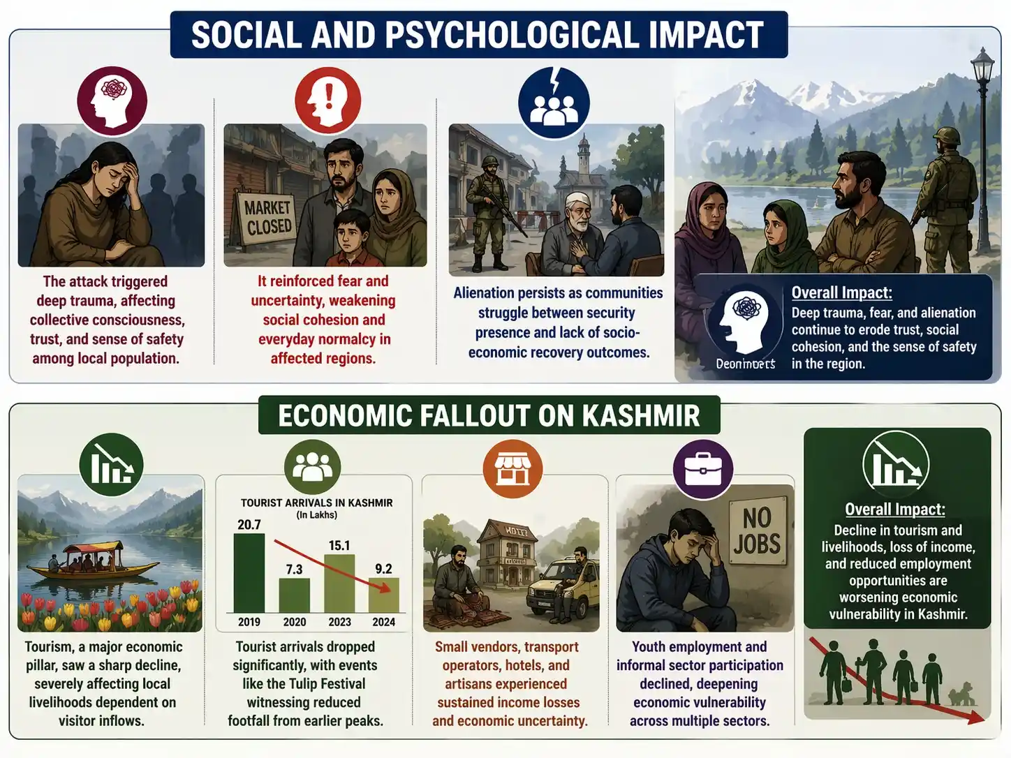 - Greater investment in tourism revival, infrastructure, and local industries is needed to restore economic confidence in Kashmir.