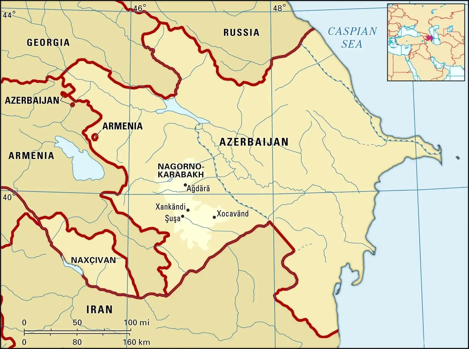 - Bounded by: Caspian Sea to the east, Russia to the north, Georgia to the northwest, Armenia to the west and Iran to the south
